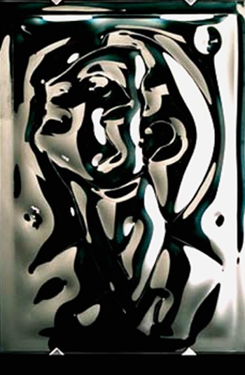 All the lines in the portrait are bent into the glass and were then hand pinstriped with white automotive enamel. Most of the white you see in the photograph is reflected light from the bounce cards in the studio. Technically it is one of my best pieces.