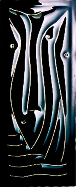 Mask of Fish and Fowl started life as a commission piece for Ken Hagard and Polly Cooper. They are renowned architects and head the firm San Luis Solar Group. Unfortunately, some years back, their home and offices burned down in a canyon wild fire. Total loss. It was so hot it melted steel beams. So they rebuilt on the same site and asked me to design and make the interior doors, clerestory windows, cabinet faces and light sconces. The site was historically a trout farm and they wanted to honor that by incorporating the theme of birds, fish and water in the pieces. Hence the design of Mask of Fish and Fowl. Which was rejected by Ken and Polly. Duende is the design that evolved from the process. Lucklly, Mask of Fish and Fowl was chosen by the Corning Museum of Glass as one of the significant pieces made in the world during 1999. When I told Ken that the rejected design was awarded by Corning he was totally unfazed. "The design I have is better." What could be better. Everybody’s happy.
