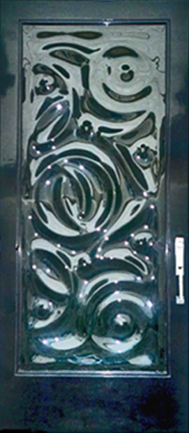 This piece was commissioned by architect John Pryor for the Smith family beach house in Cayucos, California. It is a very large door. The glass panel is 32″ x 76″. It was a fun project and the Smiths were very nice to work with.