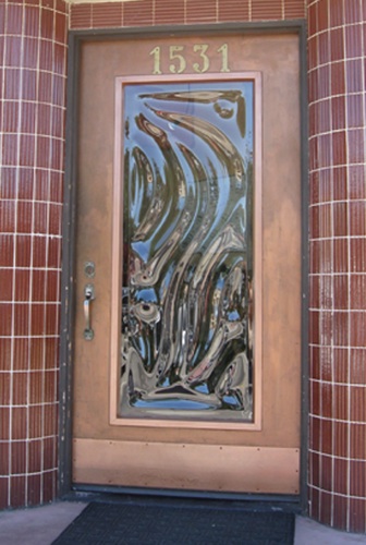 The Steynberg Gallery is a old architectural gem. It was originally the Farmer Brother’s Coffee Building, built in the 1930’s. A simple Art Deco design. Who knows what happened to the original front door, but it’s long gone. The building had a solid wood door when Peter Steynberg purchased the building so he had the center cut out and a piece of plain glass installed. I made Viento for Peter to compliment the Art Deco style of the building and to reawaken the entrance. It works. It rocks. And Peter loves it.